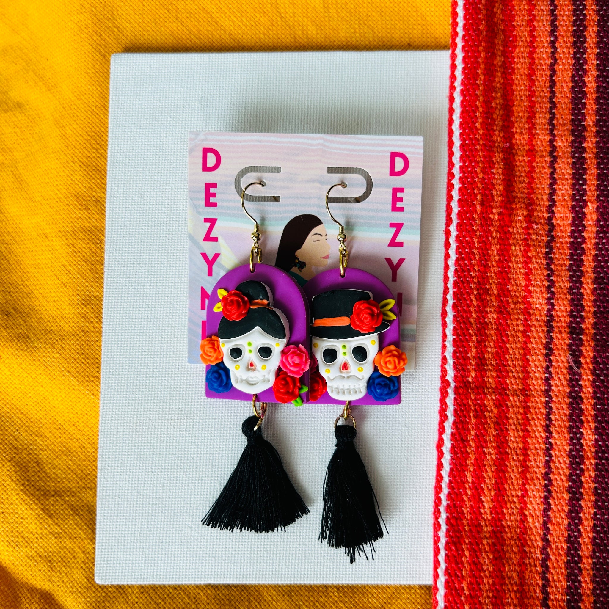 Handmade sugar skull inspired earrings with bold and colorful florals