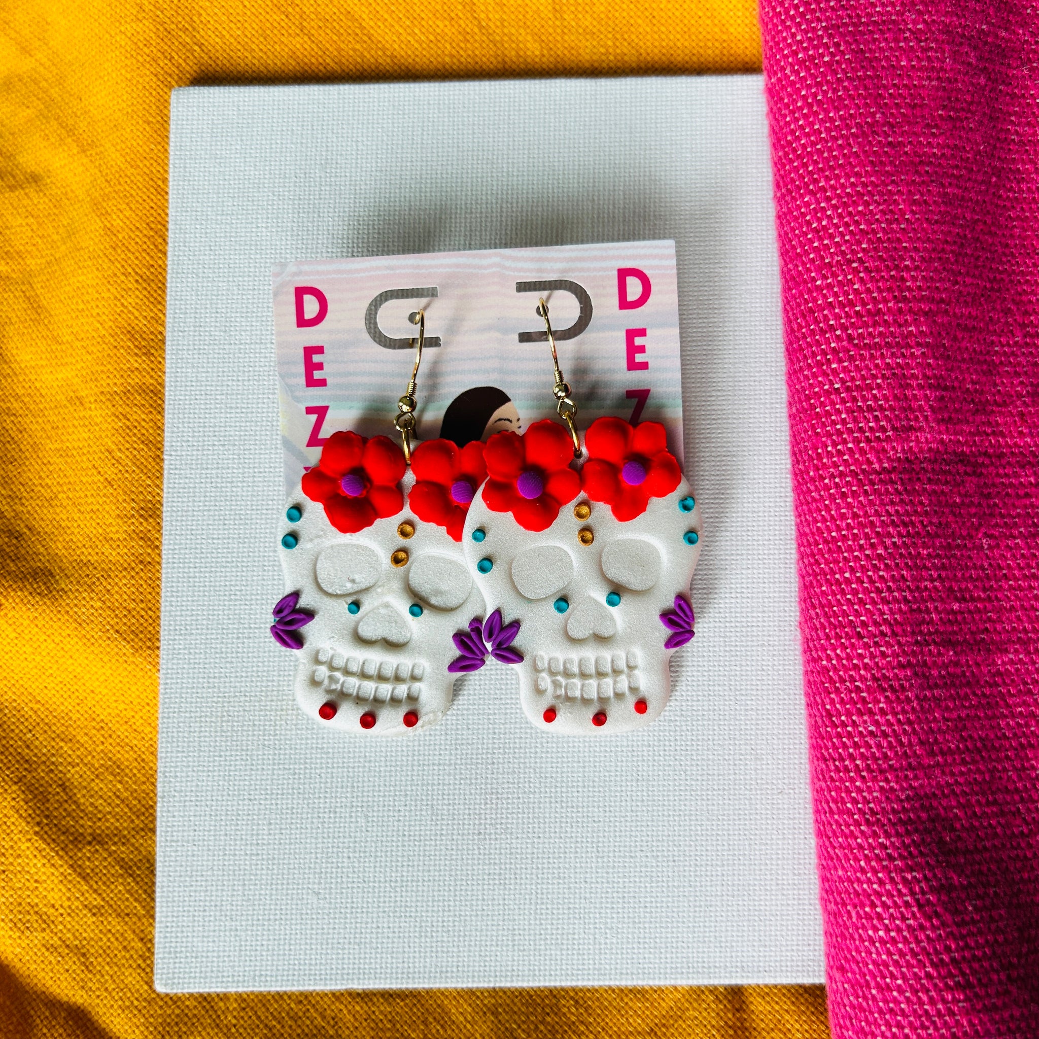 Handmade sugar skull inspired earrings with bold and colorful florals